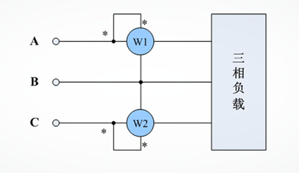 圖1中,單相功率表或三相功率表的某一相W1測(cè)量的是P1=UAB*IA*cosφAB,W2測(cè)量的是P2=UCB*IC*cosφCB。則三相電路總功率為:P=P1+P2。