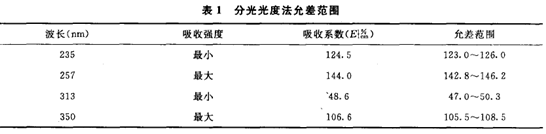 精密稱取在120℃干燥至恒重的基準(zhǔn)重鉻酸鉀約60mg,置1000m1量瓶中,用0.005mo1L硫酸液溶解并稀釋至1000m1,用配對(duì)的1 cm石英池,以0.005mo1L硫酸液為空白,在235,257,313,350nm分別測(cè)定吸光度,然后換算成E,測(cè)得值應(yīng)符合表1中規(guī)定的允差范圍。