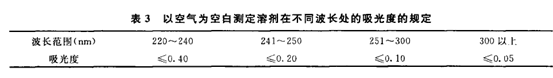4.含有雜原子的有機(jī)溶劑,通常均具有很強(qiáng)的末端吸收。因此,當(dāng)作溶劑使用時(shí),它們的使用范圍均不能小于截止使用波長(zhǎng)。例如甲醇、乙醇的截止使用波長(zhǎng)為205nm。另外,當(dāng)溶劑不純時(shí),也可能增加干擾吸收。因此,在檢查所用的溶劑在供試品所用的波長(zhǎng)附近是否符合要求,即將溶劑置1 cm石英吸收池中,以空氣為空白(即空白光路中不置任何物質(zhì))測(cè)定其吸光度,溶劑和吸收池的吸光度應(yīng)符合表3規(guī)定。