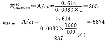 規(guī)定的吸收系數(shù),系指E,即在指定波長(zhǎng)時(shí),光路長(zhǎng)度為1 cm,試樣濃度換算為1%(gml)時(shí)的吸光度值,故應(yīng)先求被測(cè)樣品的E值,再與規(guī)定的E標(biāo)準(zhǔn)值比較,可計(jì)算出供試樣品的含量。