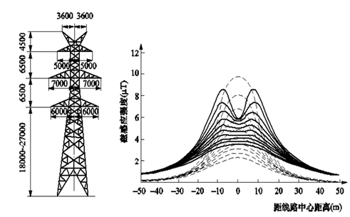 圖1列舉了220kV電壓等級,采用貓頭型鐵塔,三相單回路,導線呈三角型布置的輸電線路下,離地1m高度處的磁場橫向分布計算曲線。曲線以鐵塔中心線為坐標原點(O點),顯示了磁感應強度(磁通密度)隨距離的衰減關系。該圖曲線對應的計算線路電流為300A(采用LGJ—300鋼芯鋁絞線),圖中曲線自上至下對應導線對地計算高度h分別為8、9、10、11、12、13、14、15、16、17m。