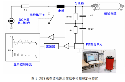 電力電纜由于其電容量大,很難在現(xiàn)場進(jìn)行工頻電壓下的局部放電檢測。過去充油電纜采用直流試驗(yàn),可以大大降低電源的要求。但對XLPE電力電纜,由于其絕緣電阻較高,且交流和直流下電壓分布差別較大,直流耐壓試驗(yàn)后,在XLPE電纜中,特別是電纜缺陷處會殘留大量空間電荷,電纜投運(yùn)后,這些空間電荷常造成電纜的絕緣擊穿事故。采用超低頻(0.1Hz)電源進(jìn)行試驗(yàn),要求試驗(yàn)時(shí)間長,電纜絕緣損傷較大,可引發(fā)電纜中新的缺陷。振蕩波電壓是近年來國內(nèi)外研究較多的一種用于XLPE電力電纜局部放電檢測和定位的電源。該電源與交流電源等效性好,作用時(shí)間短、操作方便、易于攜帶,可有效檢測XLPE電力電纜中的各種缺陷,且試驗(yàn)不會對電纜造成傷害。OWTS振蕩波電纜局部放電檢測和定位裝置如圖1所示。檢測時(shí)可以靈活施加0-28kV的直流電壓,合上半導(dǎo)體開關(guān)后,被試電纜與電感產(chǎn)生阻尼振蕩。該裝置可以檢測的電力電纜電容范圍為0.05uF-2uF。