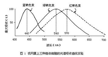 當人們做這個實驗的時候,有個驚人的發(fā)現(xiàn),那*是:發(fā)現(xiàn)了視網(wǎng)膜上不同的視錐細胞對光譜存在著三種不同的吸收,因而*出現(xiàn)了三種不同的吸收曲線。下面的曲線圖*是其一。只不過是,該圖把三種不同的視錐細胞的光譜吸收曲線畫在同一張圖上了(該圖選自劉家琦,李鳳嗚主編的《實用眼科學》第二版.北京人民衛(wèi)生出版社,1999年版.第50頁)。這張圖的意思是,用400nm到700nm的色光去單獨照射每個視錐細胞時,其結果是:反射回來的光的數(shù)量并不是一樣多,而是有三種。因而,*繪制出了三種不同的吸收曲線圖。并且,這三條曲線各自占據(jù)了光譜中的藍區(qū)、綠區(qū)、紅區(qū)的不同位置。因此人們便依據(jù)這一點得出了,視網(wǎng)膜接受外界光線刺激時,可以產(chǎn)生出紅、綠、藍三種原色的觀點。
