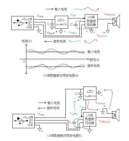 為了證明該理論,讓我們來看一個(gè)簡單的電路并考慮所示的連接。該基本電路包括三個(gè)要素,一個(gè)低壓差(LDO)線性調(diào)節(jié)器,一個(gè)微處理USB 數(shù)據(jù)線接到音頻驅(qū)動(dòng)器,和一個(gè)揚(yáng)聲器,所有這些都由一個(gè)連接到某個(gè)計(jì)算主機(jī)的USB插頭供電。在本例中,USB到音頻驅(qū)動(dòng)器必須用3.3V供電。由于揚(yáng)聲器采用音頻驅(qū)動(dòng)器的輸出供電,所以音頻輸入驅(qū)動(dòng)器需要+3.3V LDO,其由USB連接器供電(+5V),這似乎可以得到一個(gè)顯而易見的結(jié)論,即可將它們放置在圖1(a)原理圖所示的位置。但是,在這種框架下,驅(qū)動(dòng)揚(yáng)聲器工作的電流在返回到電流源驅(qū)動(dòng)器時(shí)會(huì)產(chǎn)生一個(gè)電壓反彈,該電壓反彈會(huì)反過來作用于LDO并*終影響到USB 連接器。在本例中,把USB數(shù)據(jù)轉(zhuǎn)換為音樂的基準(zhǔn)電壓會(huì)以音樂播放的速率反彈。由于揚(yáng)聲器電感所產(chǎn)生的相移會(huì)增大誤差,這將和由于電流提升產(chǎn)生的高音量混合在一起。電壓反彈也將導(dǎo)致紋波出現(xiàn),這將降低揚(yáng)聲器發(fā)出的音質(zhì)。