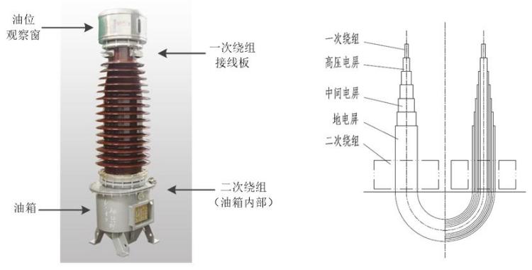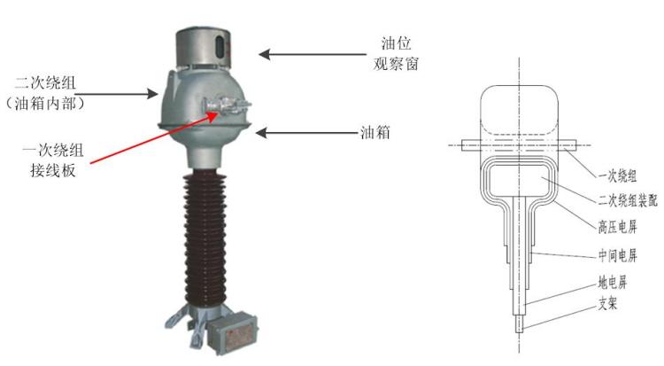 正立式電流互感器外觀與內(nèi)部結(jié)構(gòu)示意圖